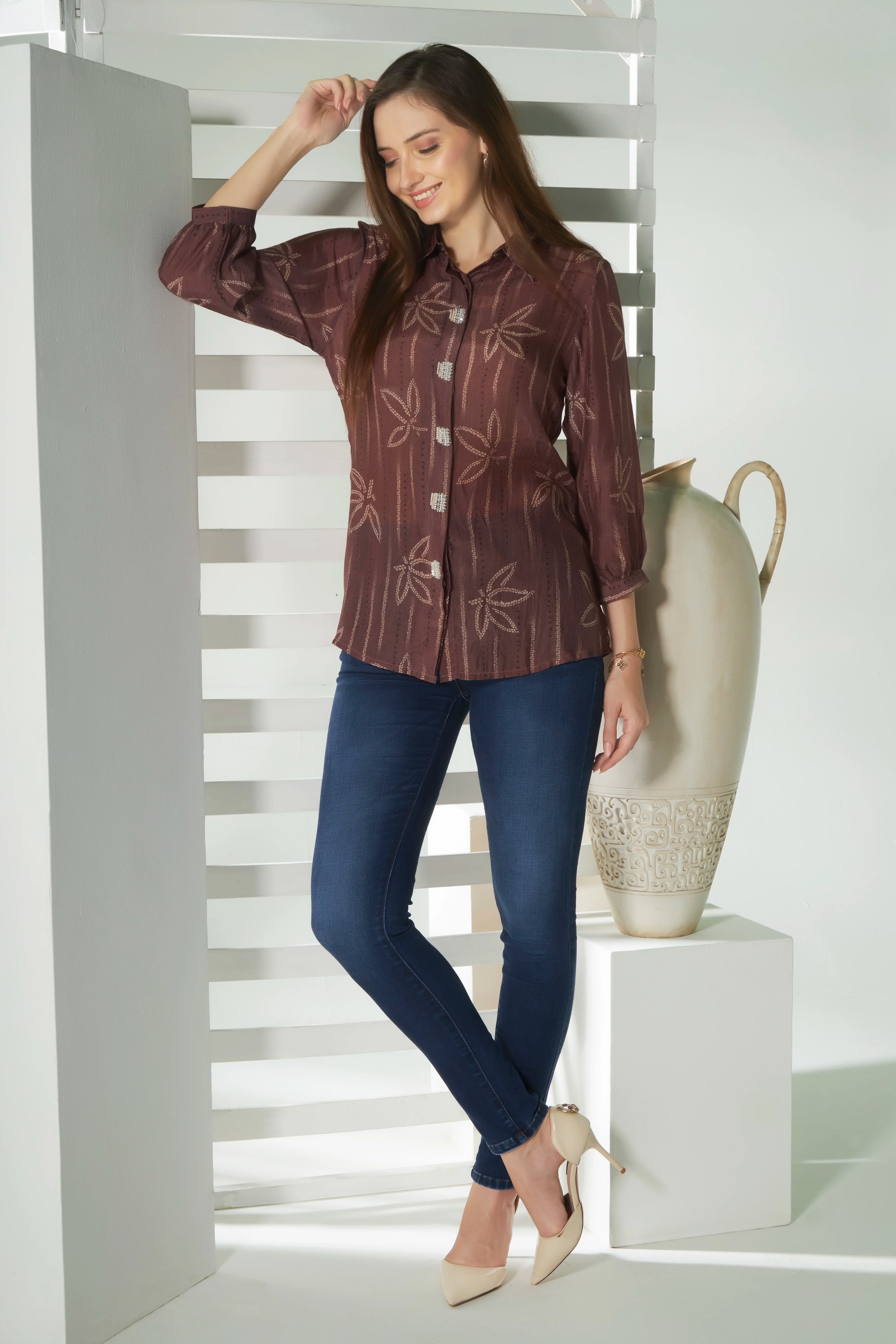 This brown printed shirt features a captivating blend of earthy tones, enhanced by delicate hand embroidery along the placket. The intricate embroidery adds a touch of craftsmanship, contrasting beautifully with the subtle print of the fabric.Perfect for those who appreciate a mix of tradition and contemporary style.