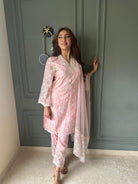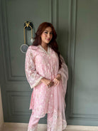 This charming outfit is a light pink three-piece suit featuring exquisite white or cream cutwork embroidery across the kurta and bottom of the pants . The straight-cut kurta has wide sleeves with embroidered edges. It is paired with a sheer organza dupatta that also features delicate matching embroidery, creating a soft and feminine look.